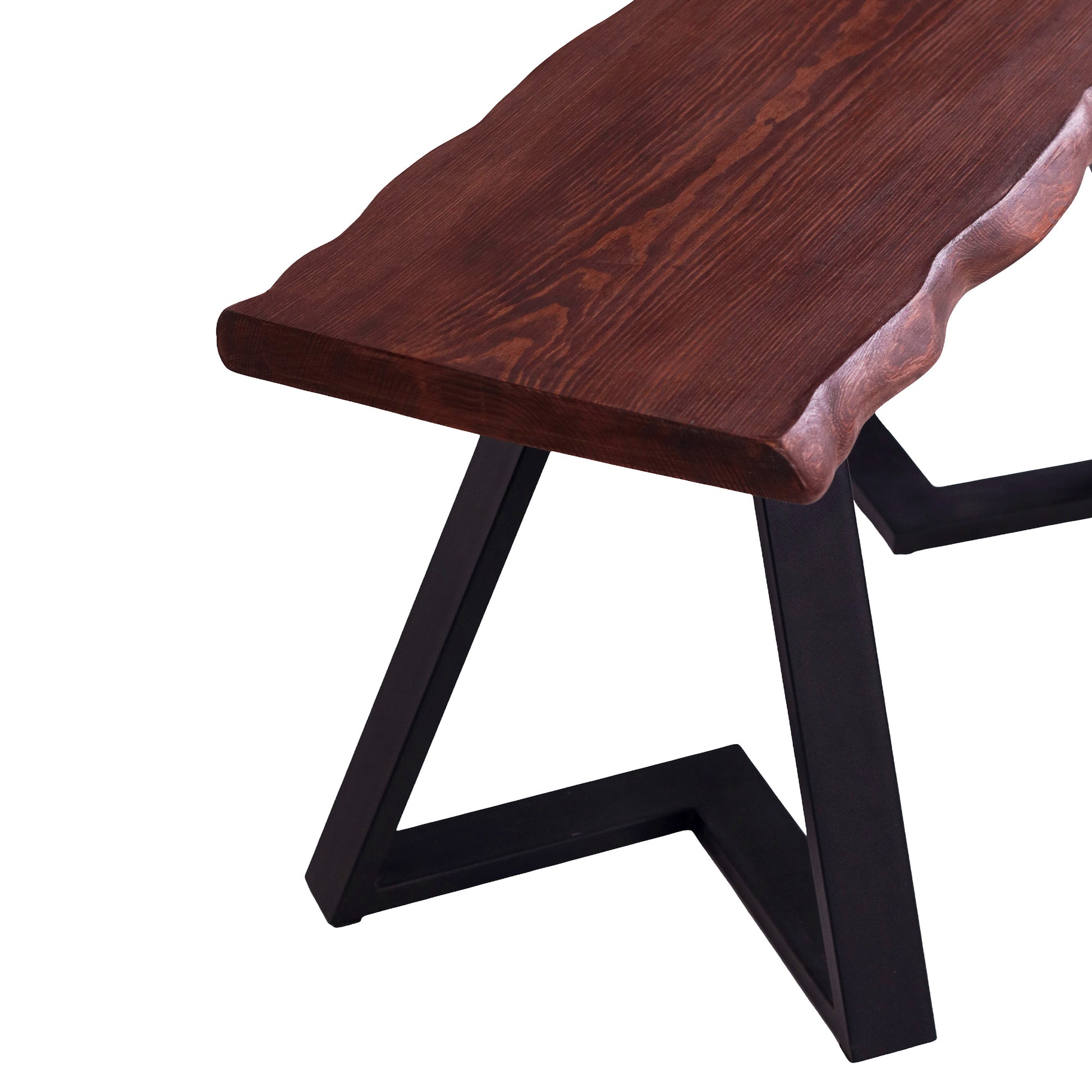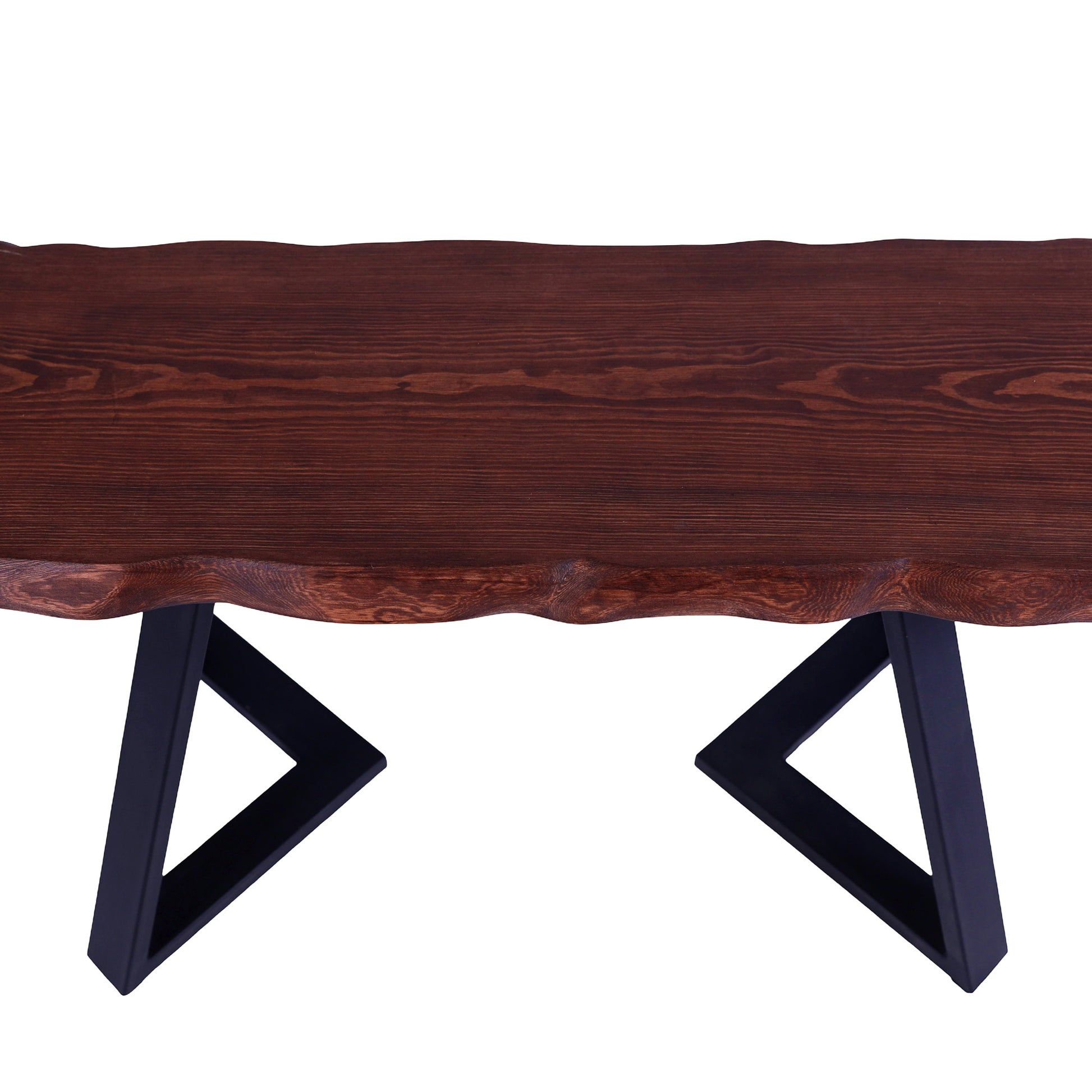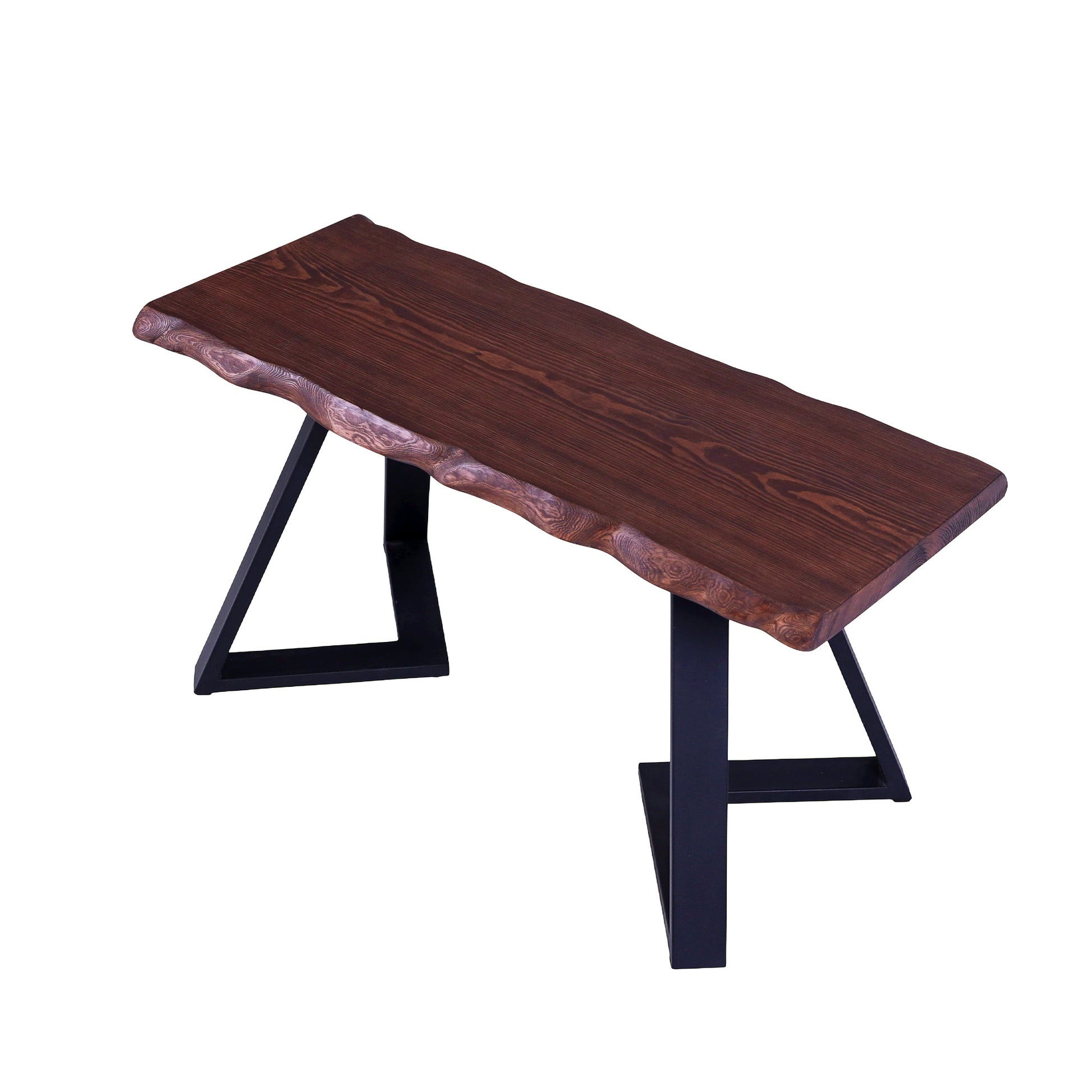 Banguotais kraštais formuotas eglės masyvo stalviršis suteikia baldui natūralumo ir švelnaus judesio pojūtį. Ryškus medienos raštas kontrastuoja su juodomis metalinėmis kojomis, kurios vizualiai palengvina formą ir užtikrina tvirtą konstrukciją.