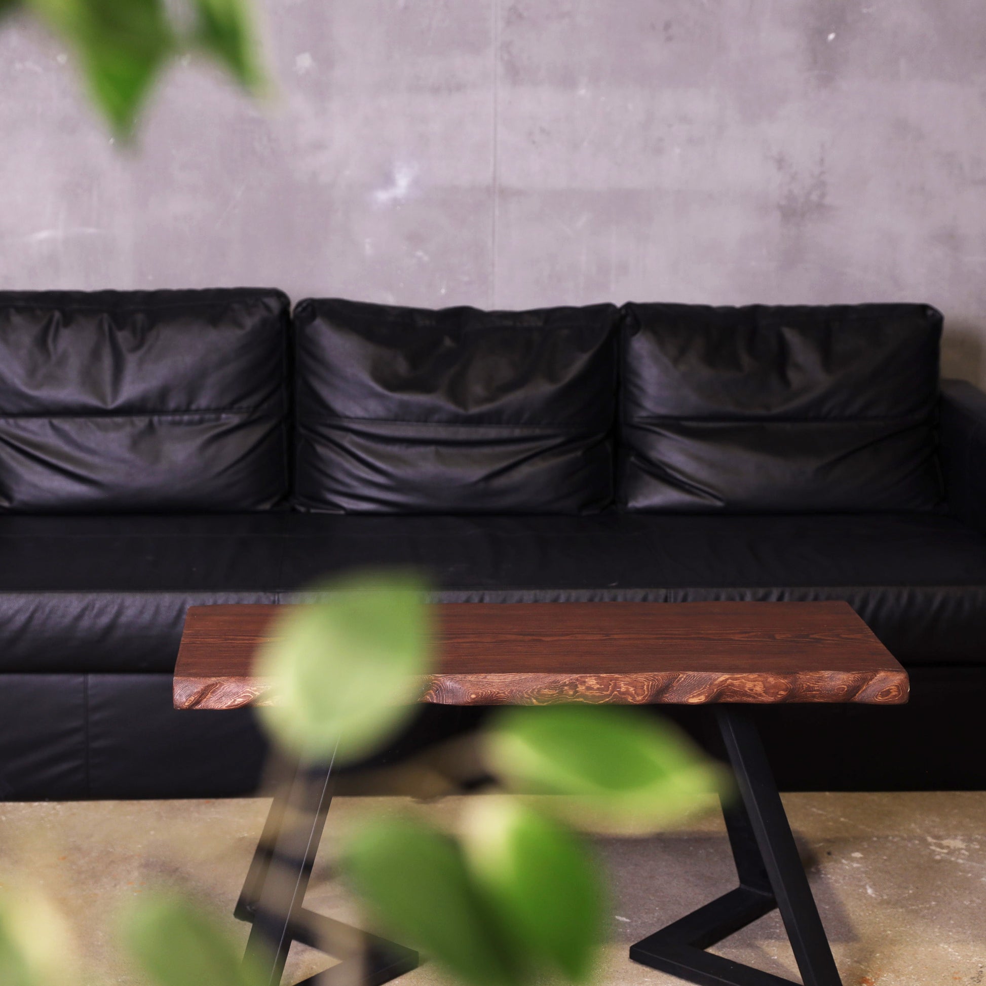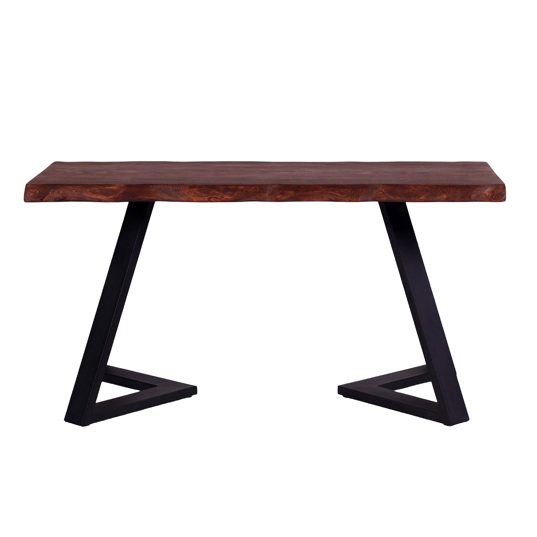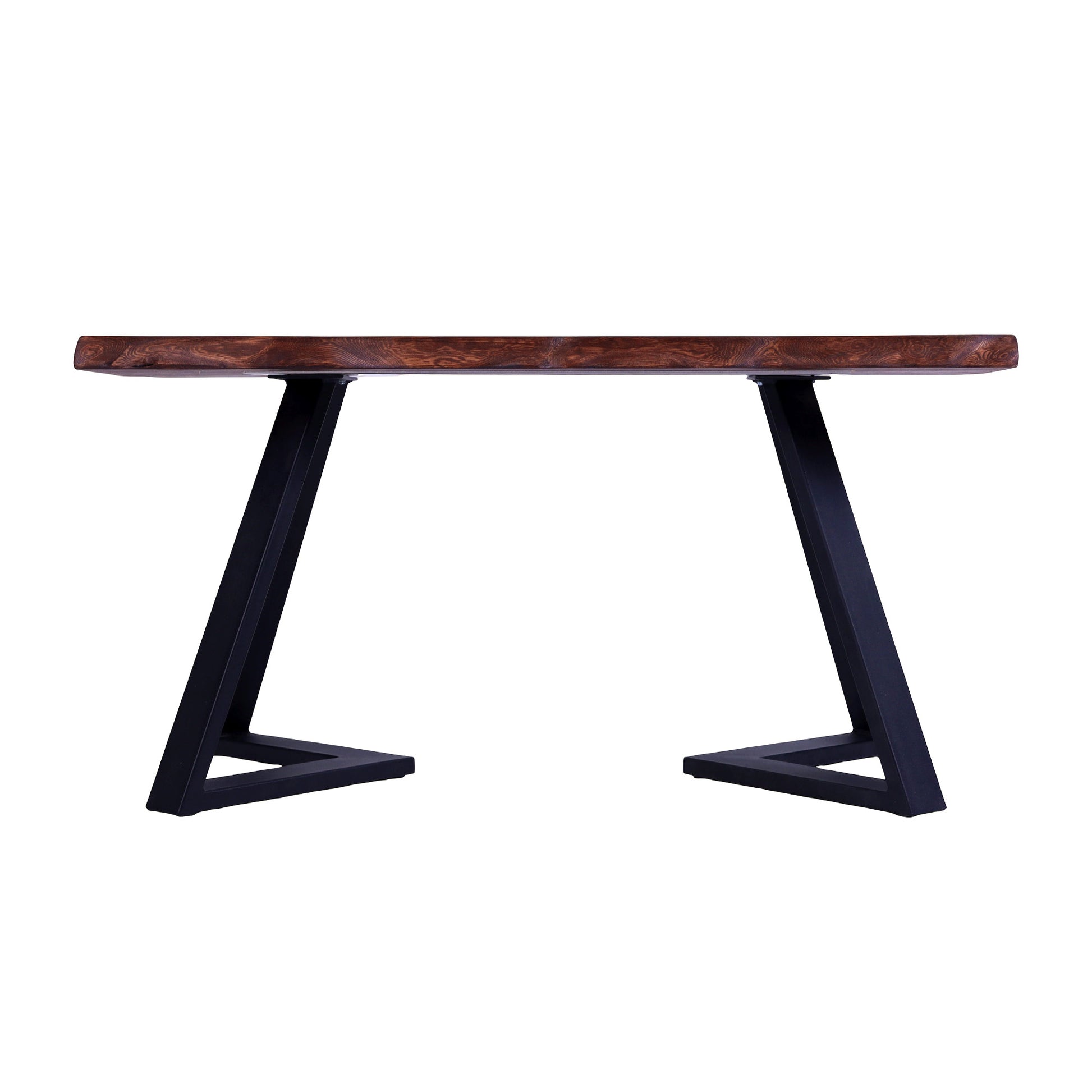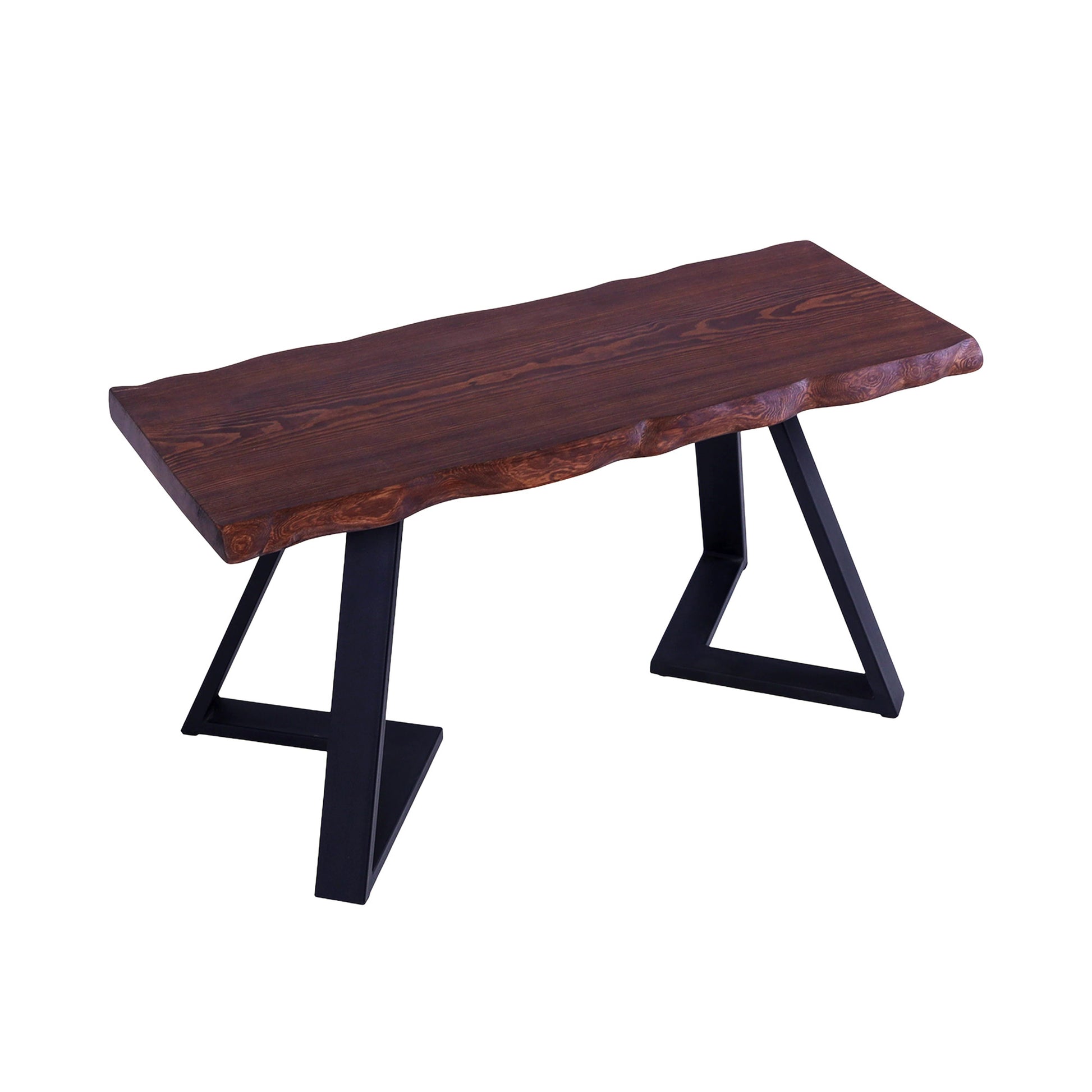 Banguotais kraštais formuotas eglės masyvo stalviršis suteikia baldui natūralumo ir švelnaus judesio pojūtį. Ryškus medienos raštas kontrastuoja su juodomis metalinėmis kojomis, kurios vizualiai palengvina formą ir užtikrina tvirtą konstrukciją.