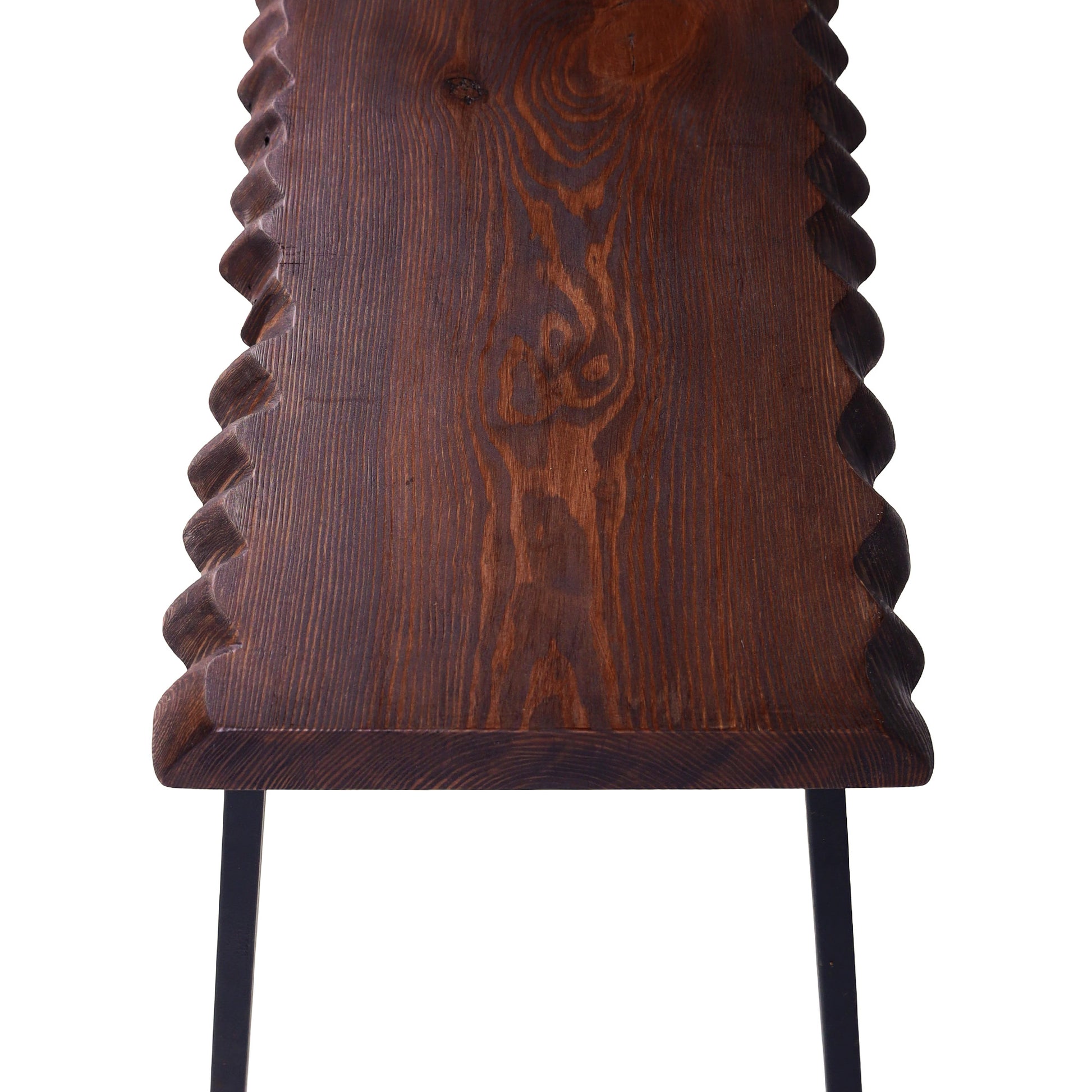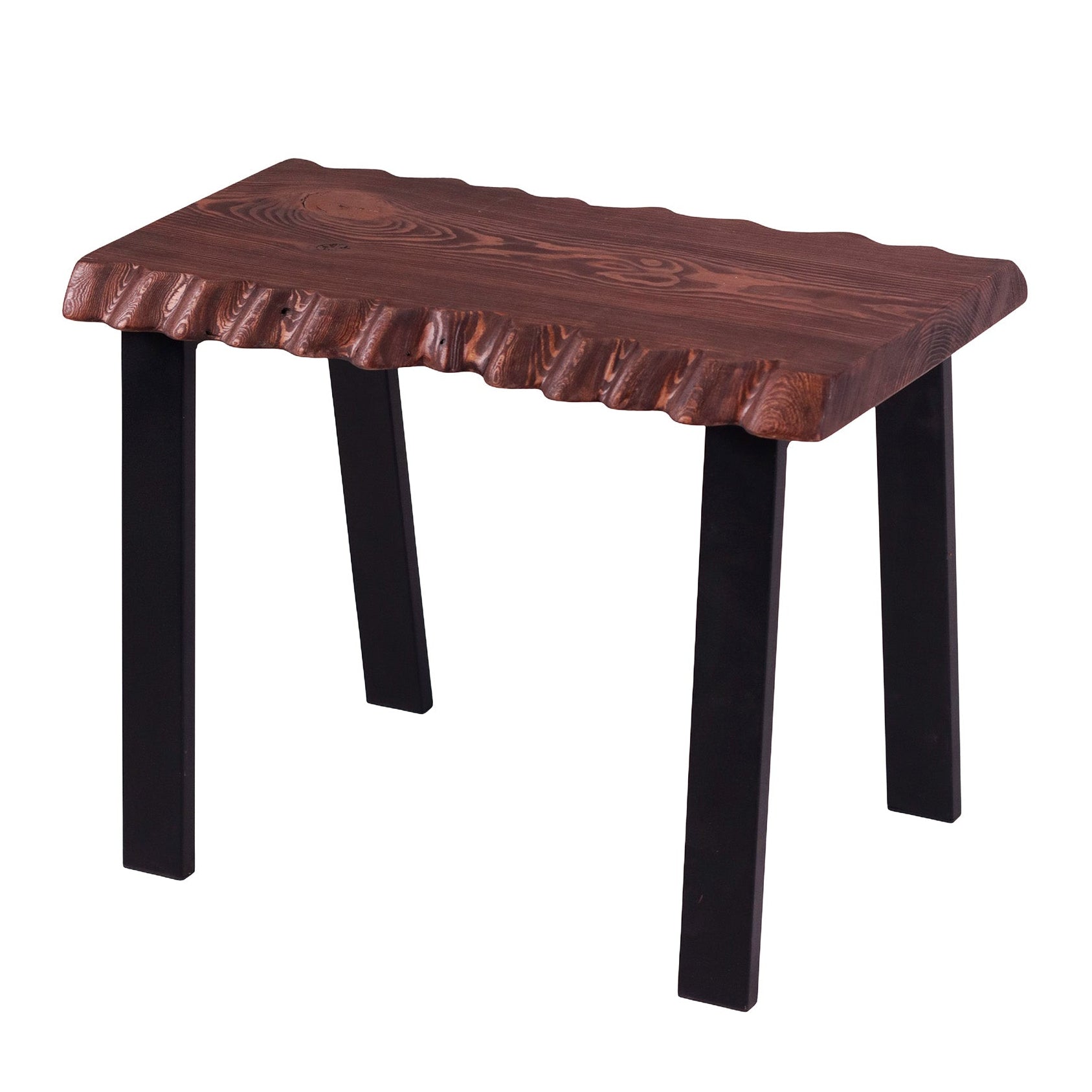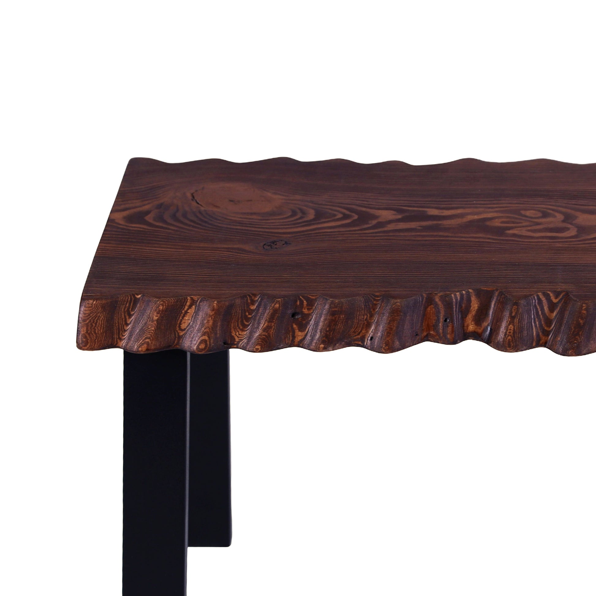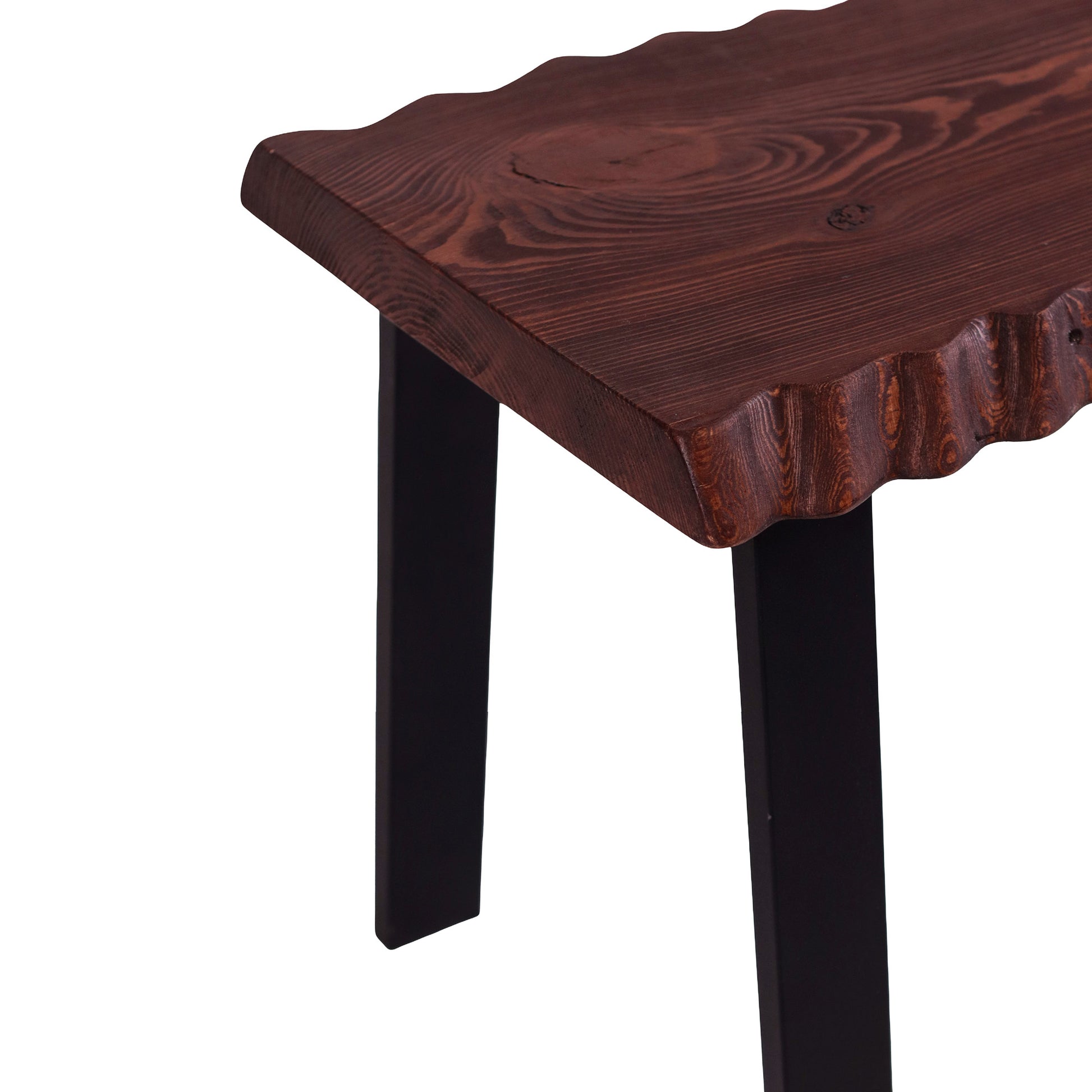 Banguoti stalviršio kraštai suteikia formai gyvumo ir natūralumo, o ryškus medienos raštas išryškina medžio charakterį. Tamsintas paviršius kuria jaukią, sodrią nuotaiką, o juodos metalinės kojos įneša modernumo ir vizualinio lengvumo.