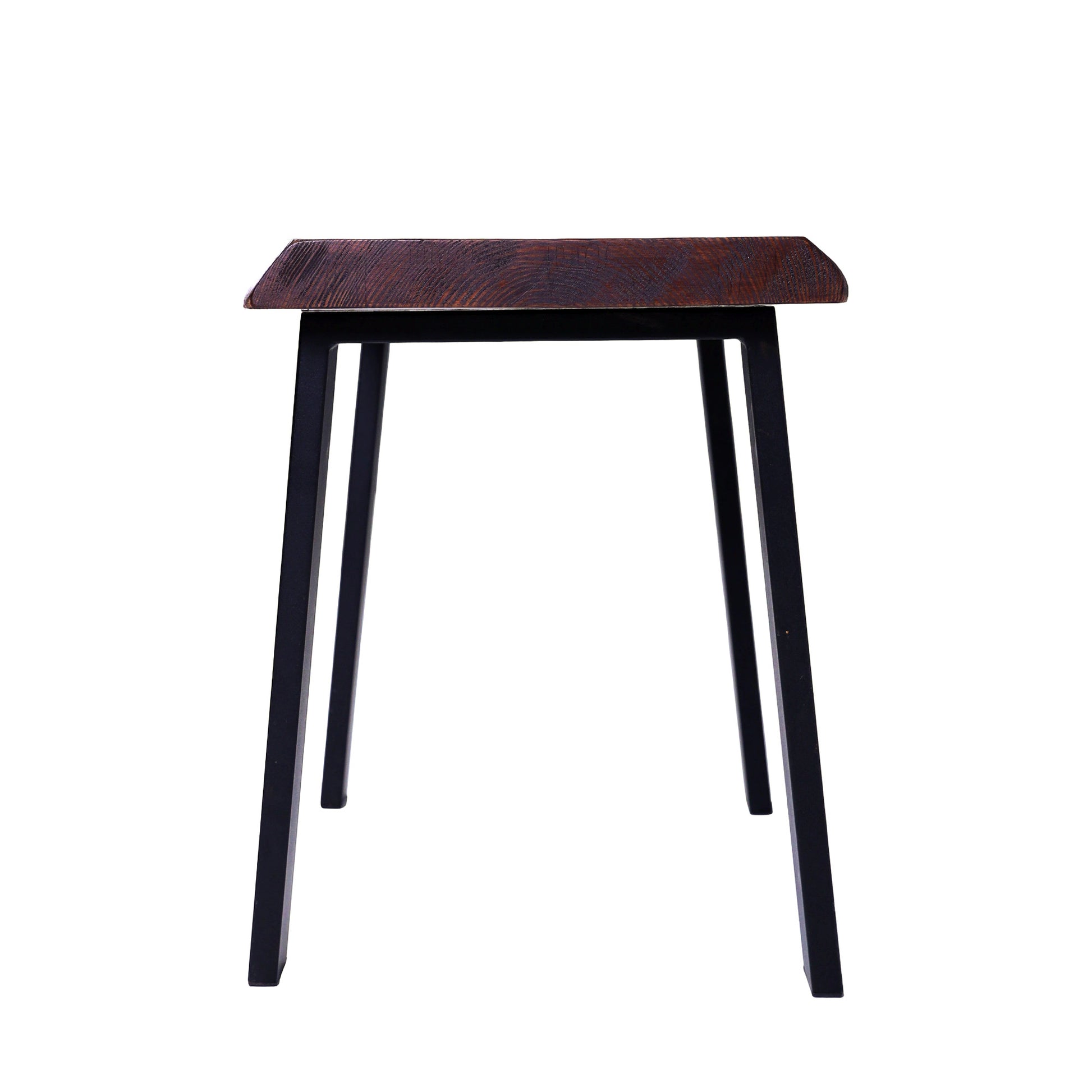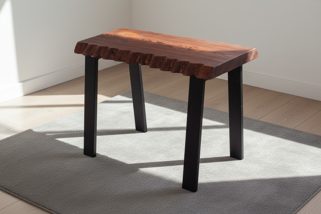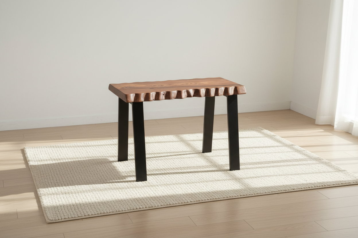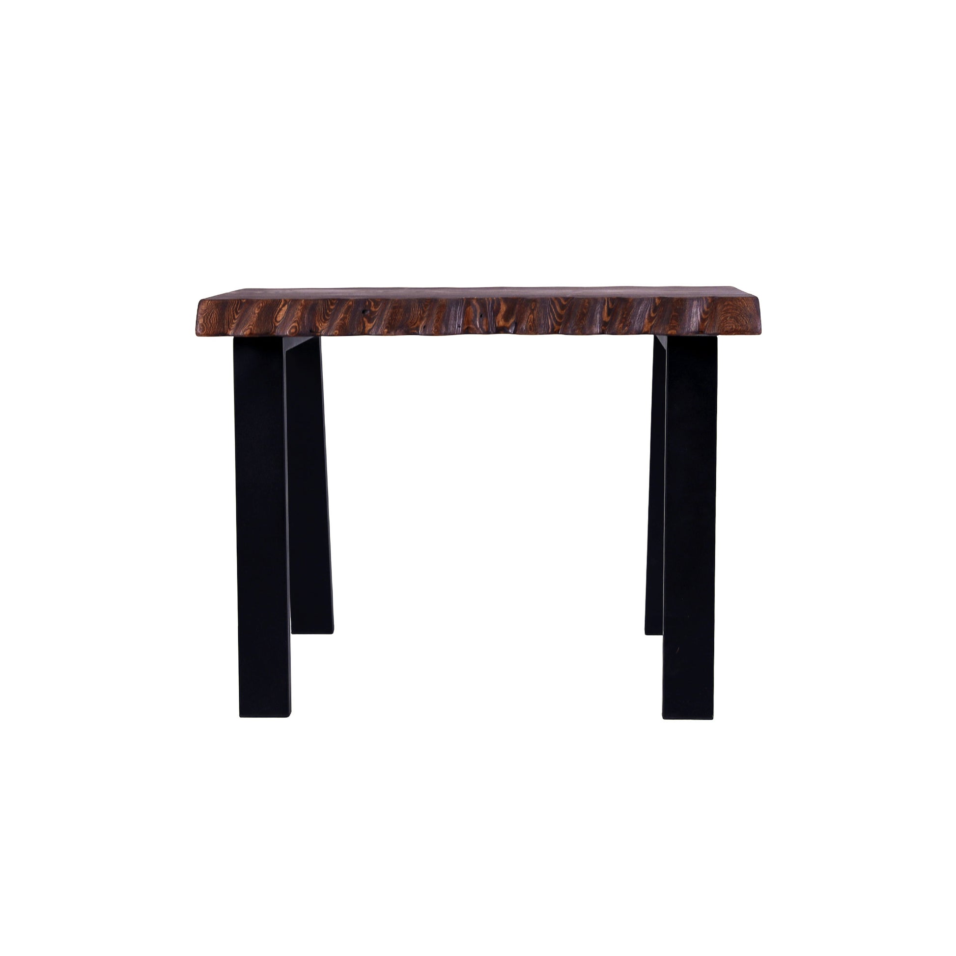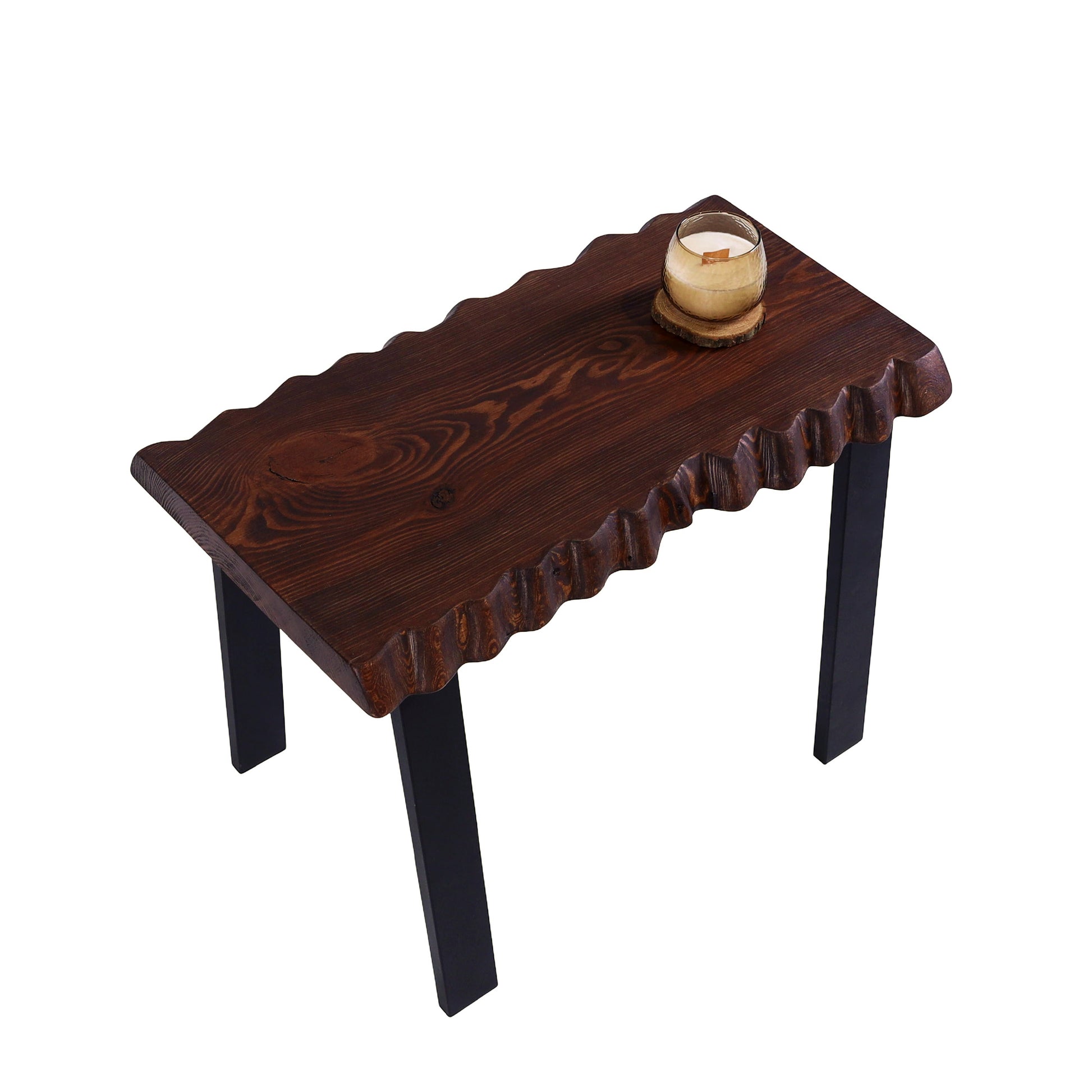 Banguoti stalviršio kraštai suteikia formai gyvumo ir natūralumo, o ryškus medienos raštas išryškina medžio charakterį. Tamsintas paviršius kuria jaukią, sodrią nuotaiką, o juodos metalinės kojos įneša modernumo ir vizualinio lengvumo.