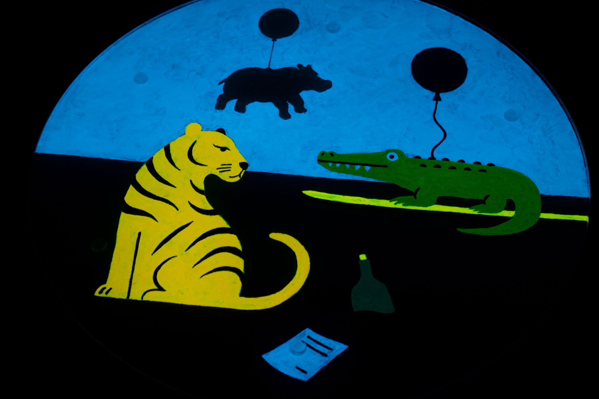 Tai kūrinys, kai instinktai sustoja ir įsiterpia vaizduotė. Tigras ir krokodilas čia nėra agresijos simboliai, jie stebi vienas kitą ir sukuria įtampą, bet ne grėsmę. Spalviniai sluoksniai neparodo realios erdvės, o žymi būsenas. Žiūrint į kūrinį, akys juda ne į gylį, o per laiką, tarsi per skirtingas emocines stadijas.