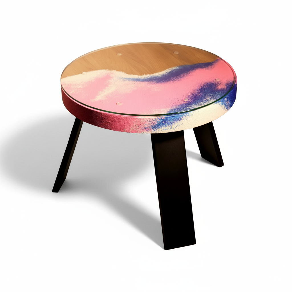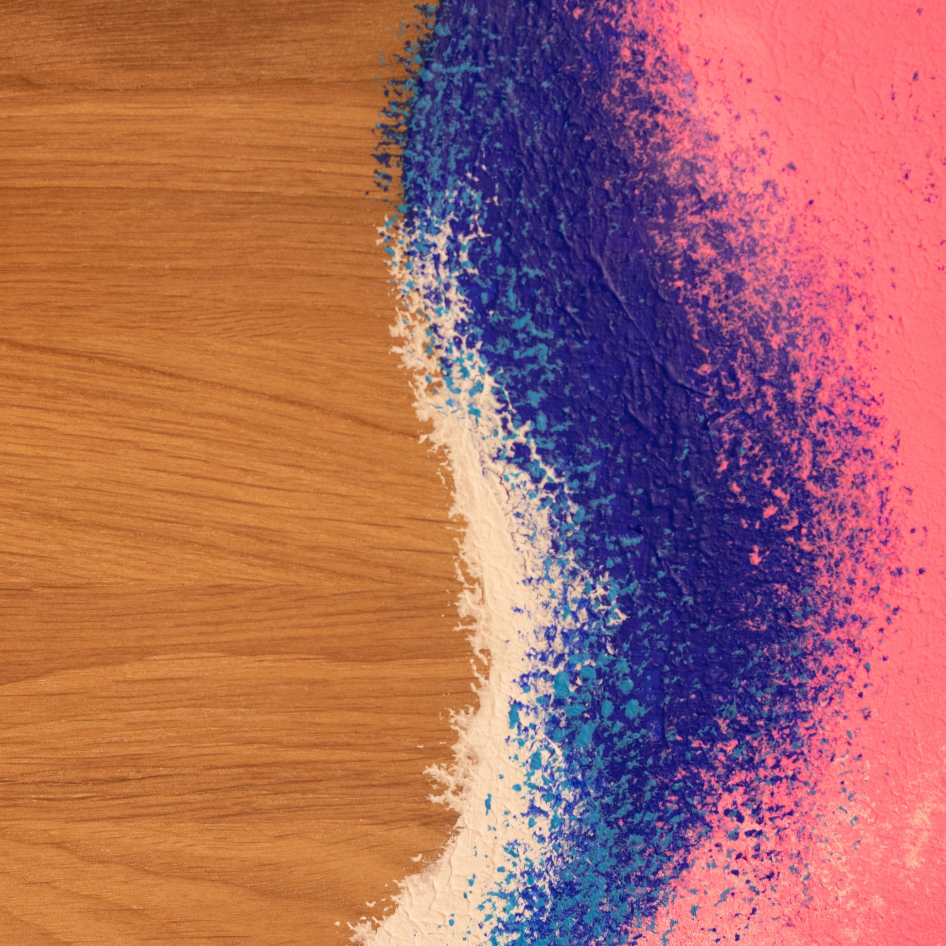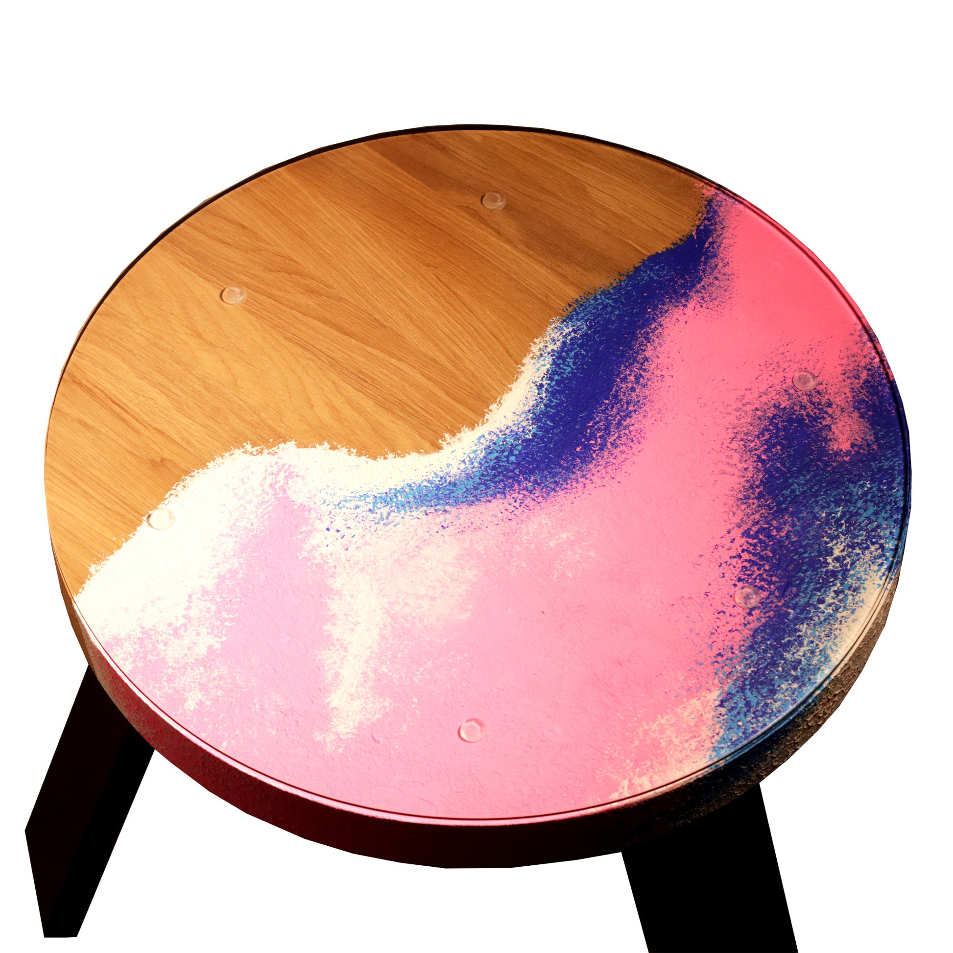 Dizainas paremtas balansu tarp natūralios medžiagos ir subtilios meninės intervencijos. Atvira ąžuolo tekstūra išlieka aiški, o spalvinė kompozicija į ją įsilieja ne dominuodama, bet papildydama. Mediena čia veikia kaip stabilus pagrindas, leidžiantis spalvai judėti laisvai.