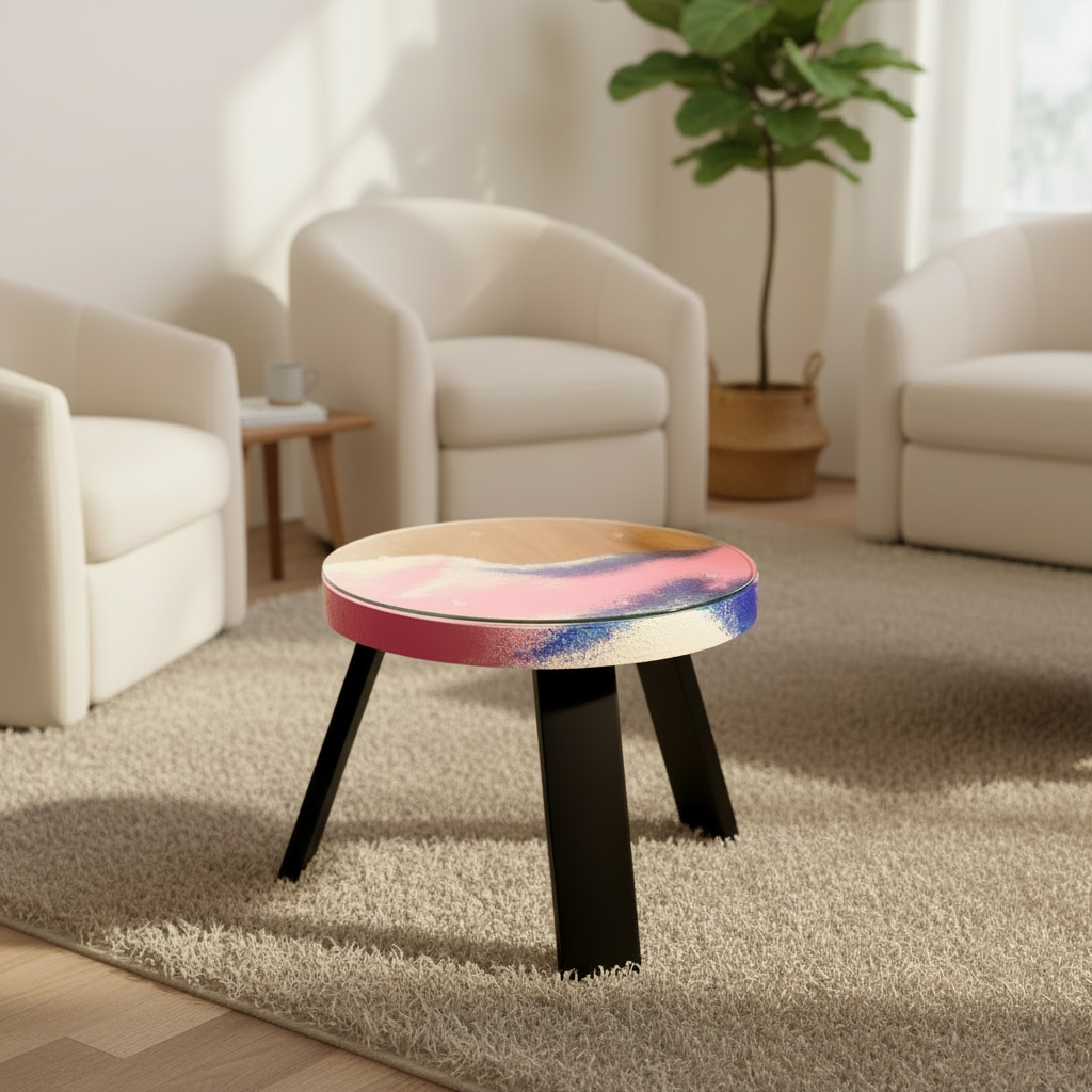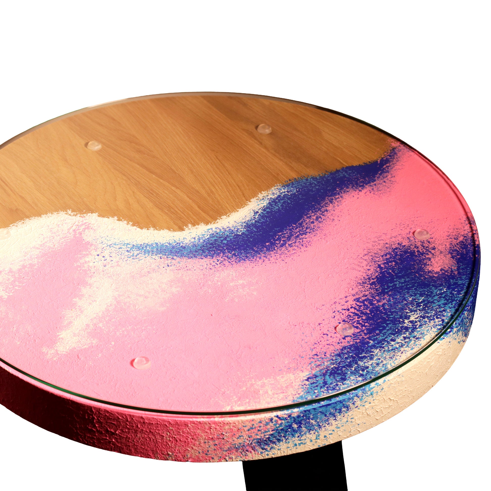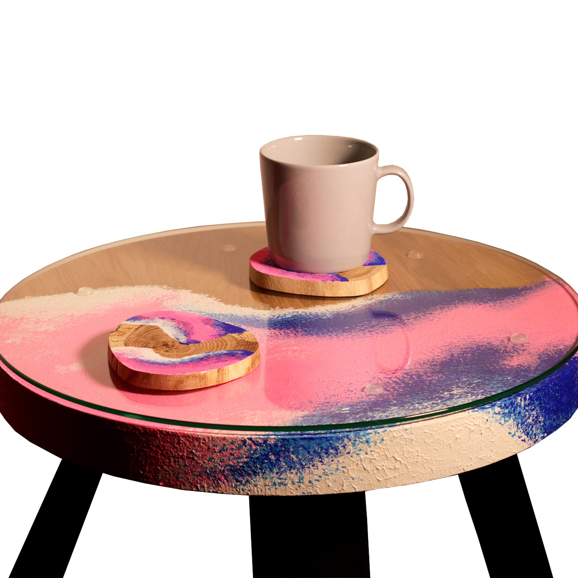 Dizainas paremtas balansu tarp natūralios medžiagos ir subtilios meninės intervencijos. Atvira ąžuolo tekstūra išlieka aiški, o spalvinė kompozicija į ją įsilieja ne dominuodama, bet papildydama. Mediena čia veikia kaip stabilus pagrindas, leidžiantis spalvai judėti laisvai.